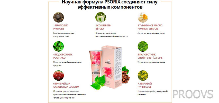 Основное отличие этого инновационного препарата от целого ряда всем известных лекарственных средств – натуральный на 100% состав, в котором нет ни грамма искусственных химических веществ (красителей, ароматизаторов, консервантов, наполнителей, вкусовых добавок), а также агрессивных ингредиентов и гормонов. Целебными компонентами крема от псориаза Psorix являются: