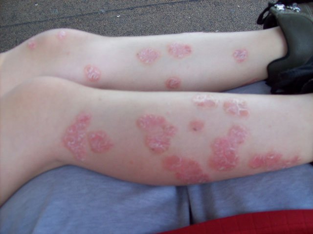 Начальная форма заболевания не вызывает у пациента серьезного дискомфорта. Она проявляется незначительным зудом и покраснением кожного покрова. Постепенно интенсивность увеличивается и на ногах возникают бляшки розового или красного оттенка. Размер папул входит в диапазон 3-5 мм, при дальнейшем развитии пятна растут и соединяются друг с другом.